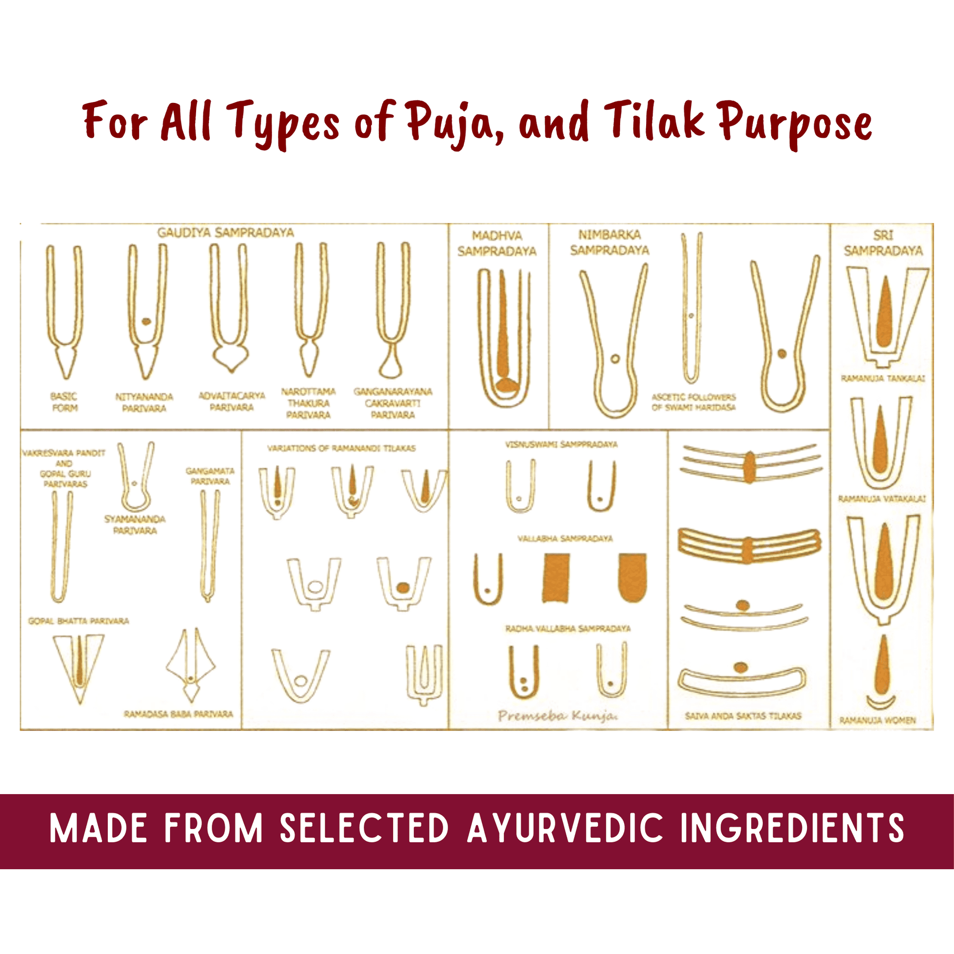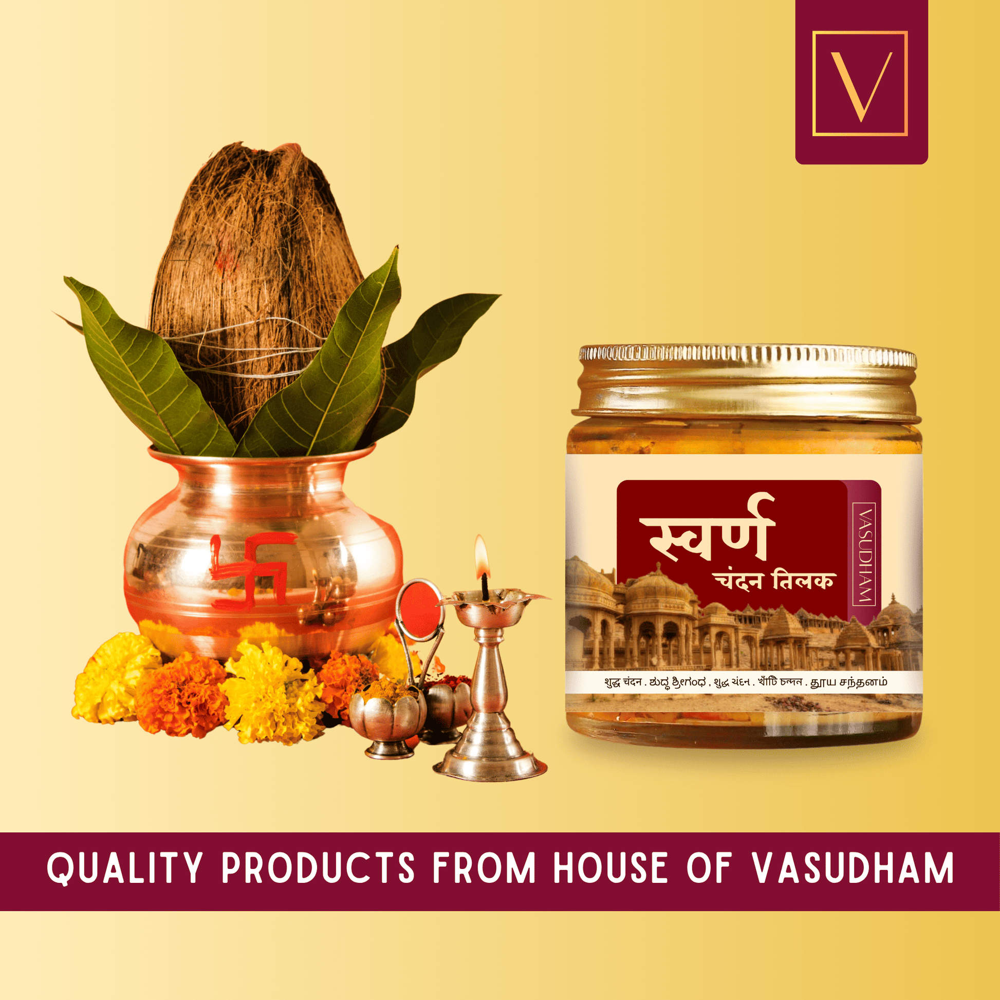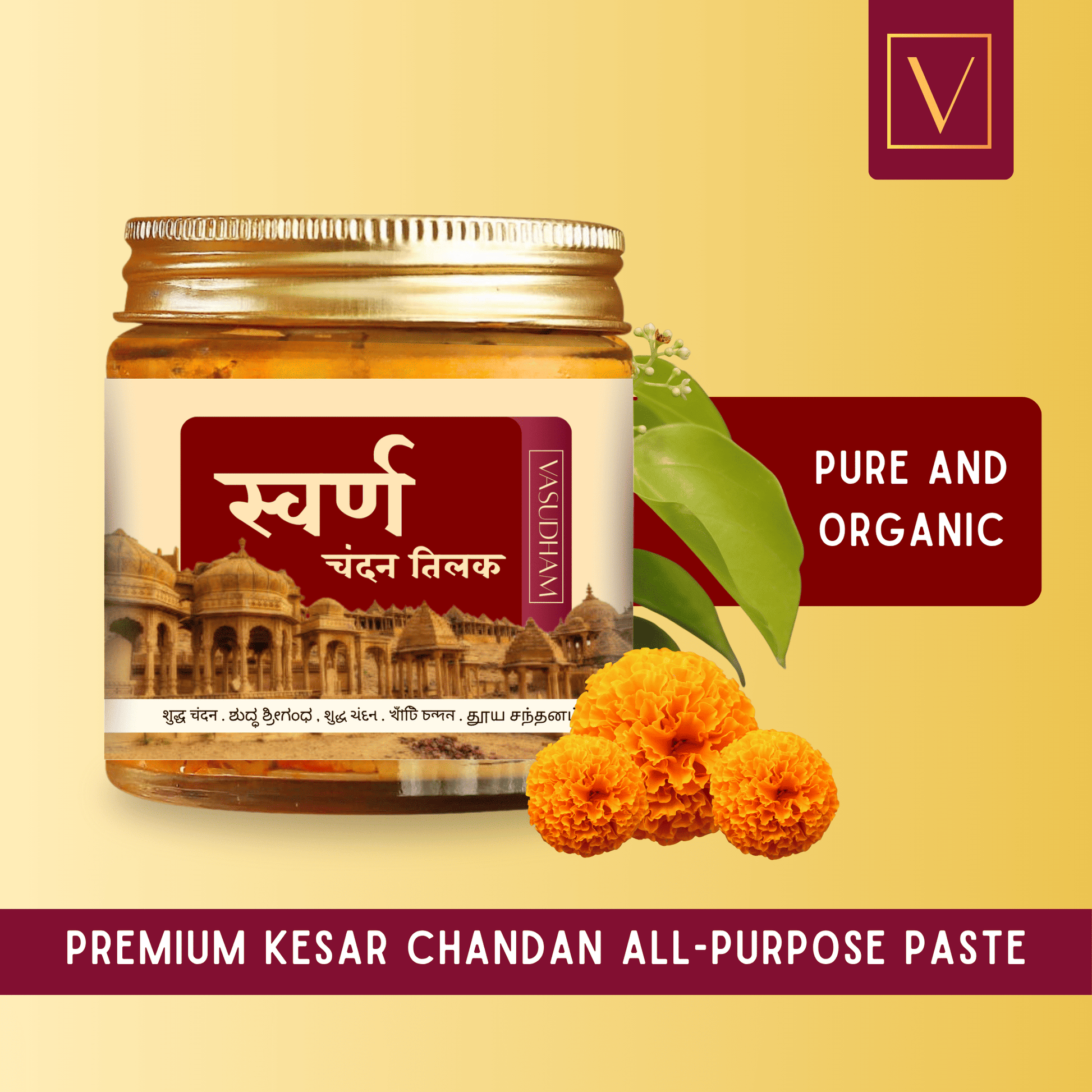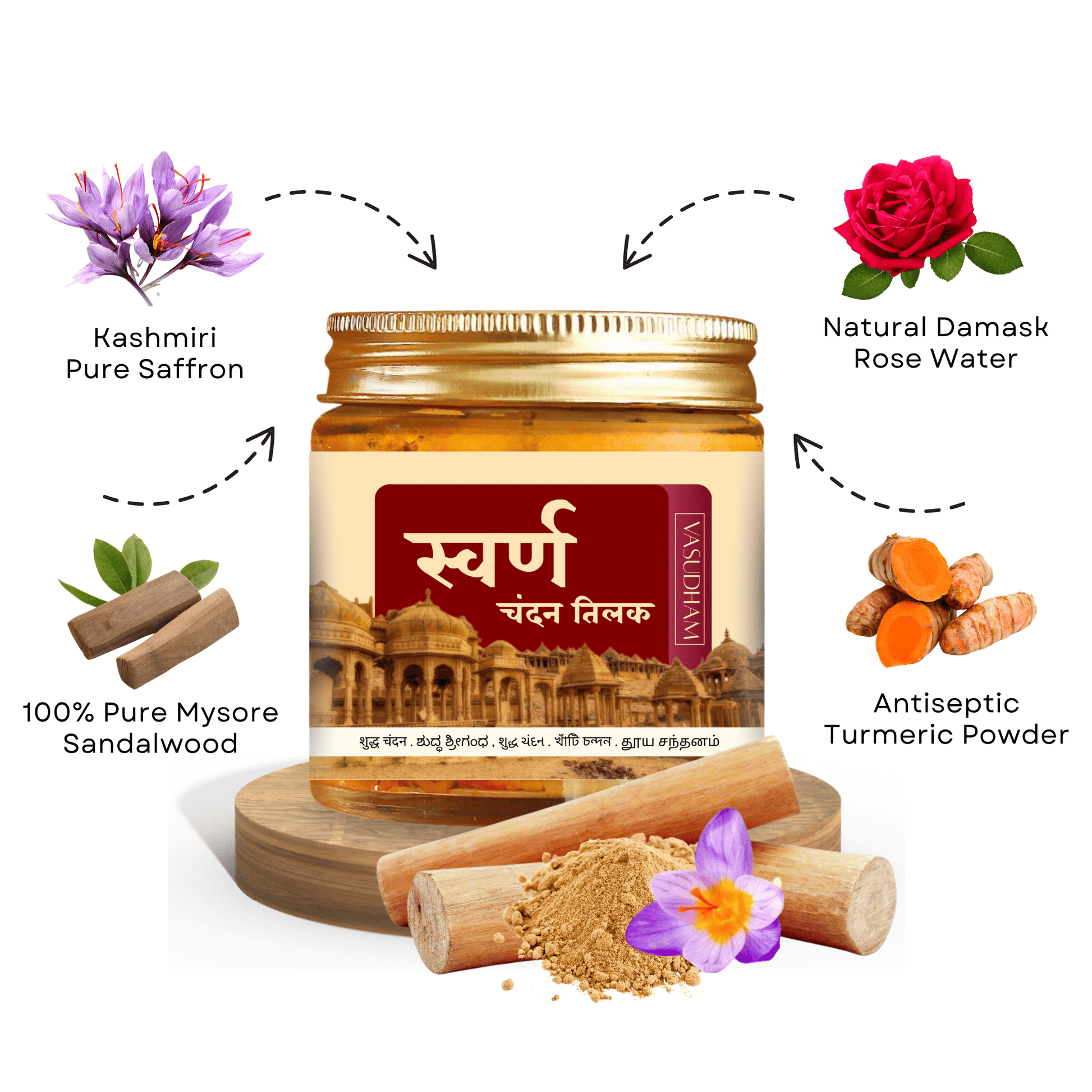 Experience divine luxury with VASUDHAM 24K Gold Chandan Tilak Paste, a premium blend of 100% pure sandalwood, real 24K gold flakes, Kesar (saffron), and rose water. Crafted for spiritual rituals, meditation, and auspicious ceremonies, this tilak not only carries sacred fragrance but also offers skin-cooling, calming, and purifying properties. Enriched with natural ingredients, it elevates your daily rituals with a royal touch. Ideal for pooja, forehead application, or gifting during festivals, it brings grace, purity, and spiritual balance in every use.
