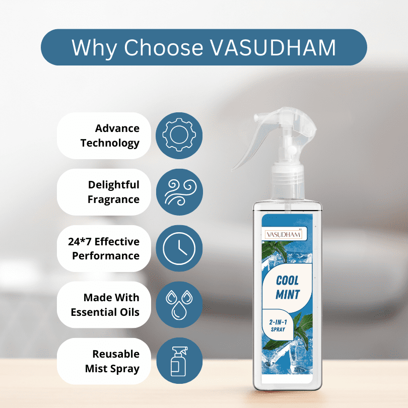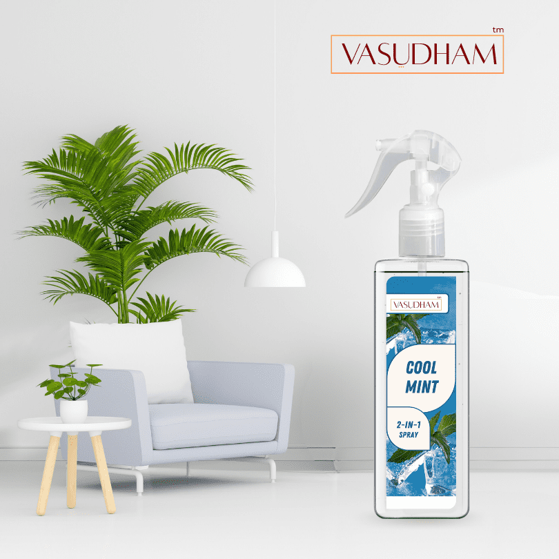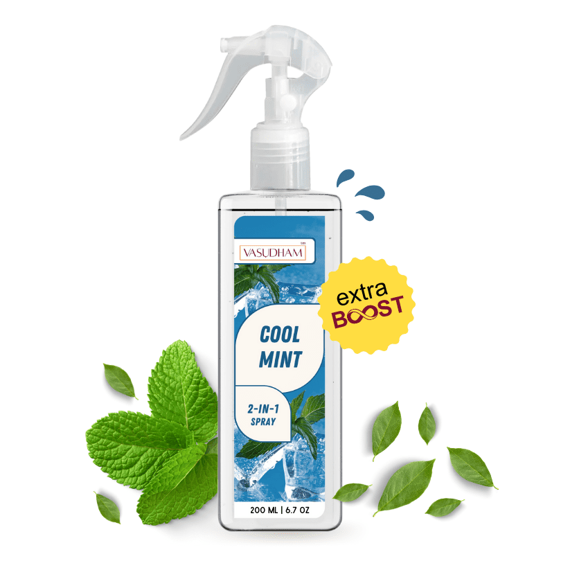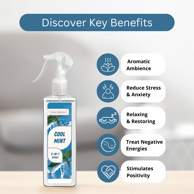Made with pure, natural ingredients and therapeutic-grade essential oils, Vasudham premium cool mint air spray room fresheners are enriched with aromatic crystals to remove pungent odors and create a pleasant atmosphere. Our 100% alcohol-free air fresheners are convenient and multipurpose, ideal as a room spray, cleansing spray, yoga mat spray, linen spray, or fabric fragrance. Begin your day refreshed with the luxurious scent of Vasudham sprays, perfect for pillows and curtains, and powerful against smoke and kitchen smells. These energetically charged sprays cleanse negativity, surrounding you with positivity and awakening your senses.