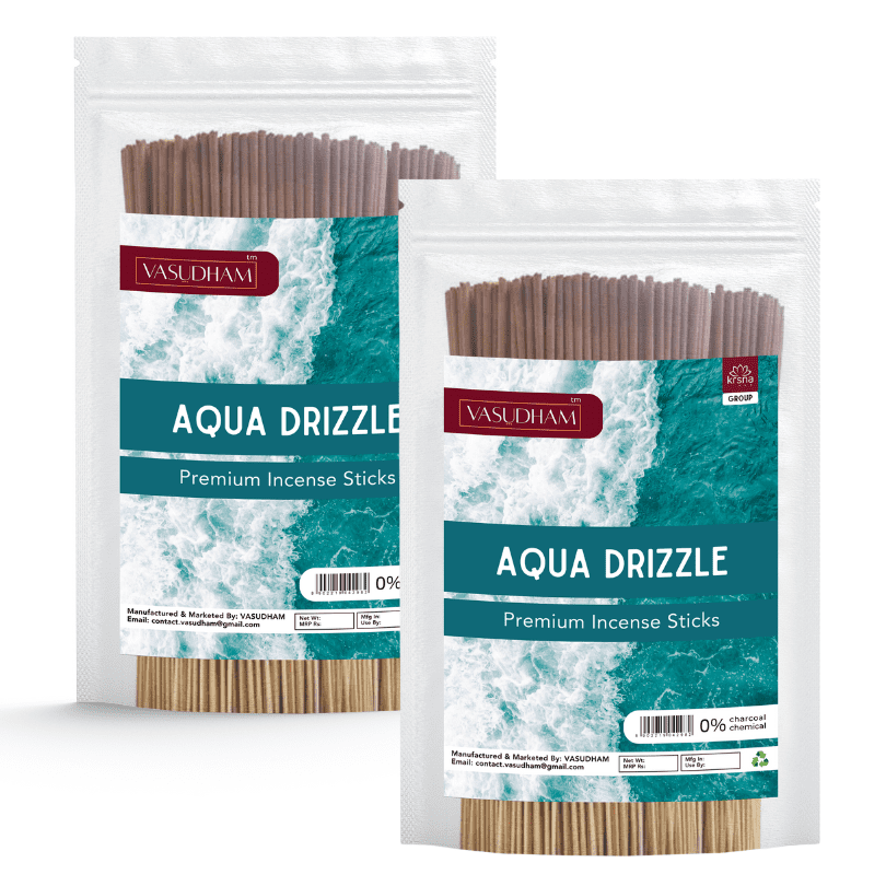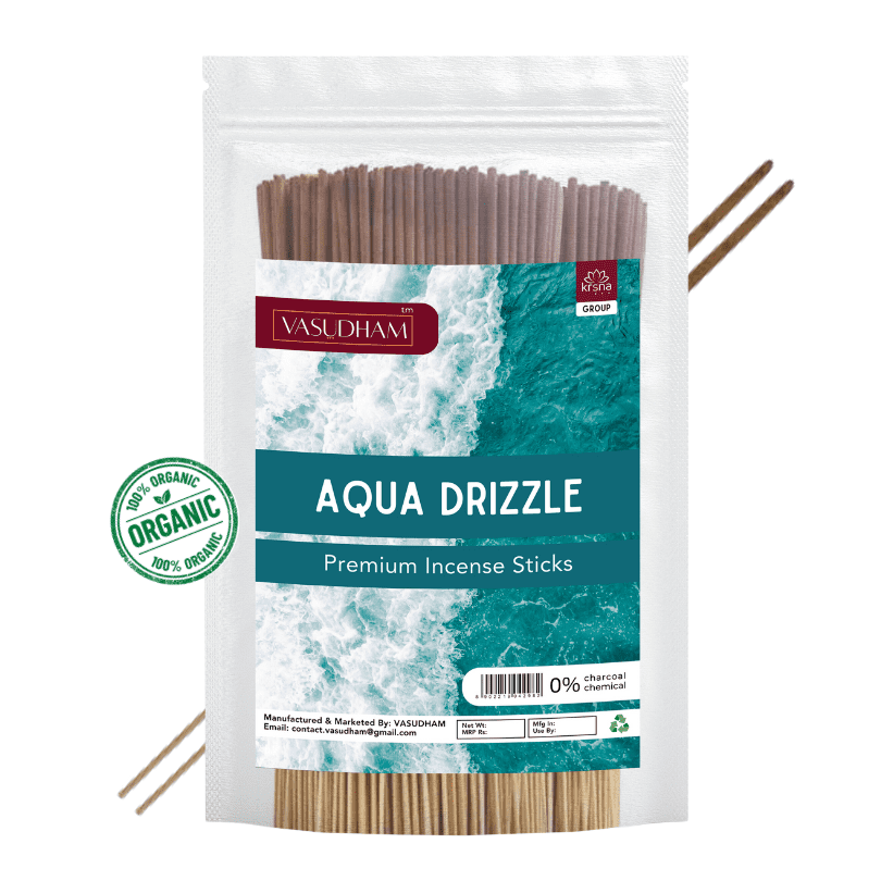 Discover the pure bliss of aqua incense therapy, featuring fresh flowers, Ayurvedic herbs, sacred wood, natural oils, and ancient holistic healing. Embrace a sweet, light, and confident fragrance for home and office. Vasudham incense sticks (Agarbatti) are ideal for air purification, aromatherapy, meditation, daily pooja, and home fragrance. Made with a rich blend of organic ingredients and essential oils, they promise to be 100% charcoal-free. Refresh your surroundings and relieve stress with Vasudham incense.
